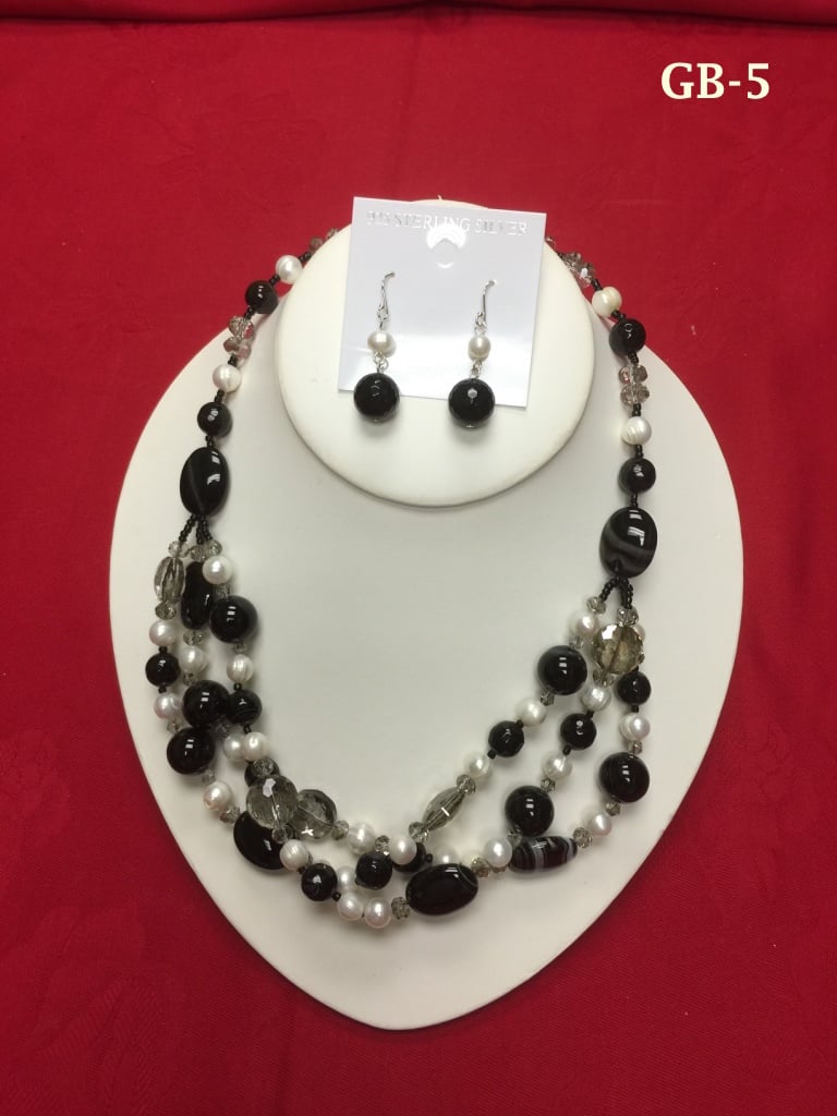 • Mix of black stones, faux pearls, and crystal-like beads