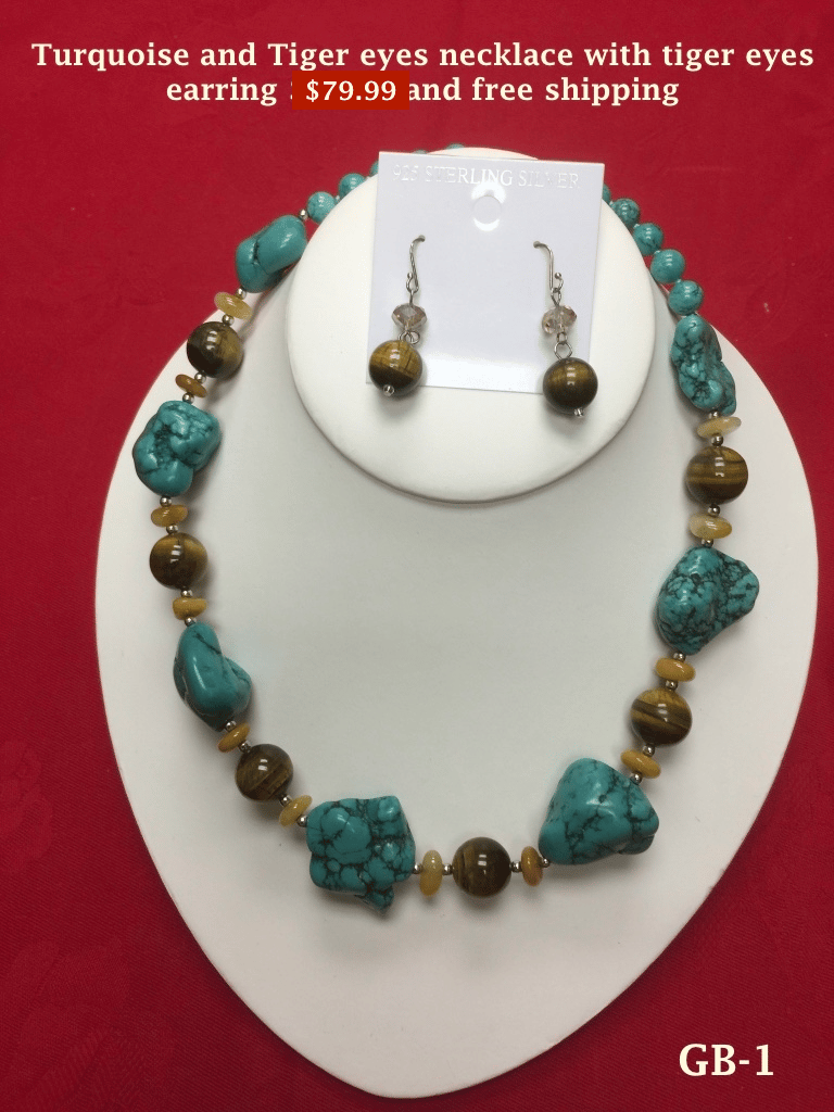 Make a bold, earthy statement with this handcrafted turquoise and tiger eye jewelry set. Featuring natural turquoise stones paired with rich tiger eye beads, this necklace brings together vibrant color and grounding energy.